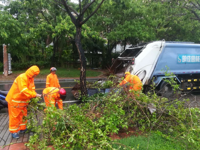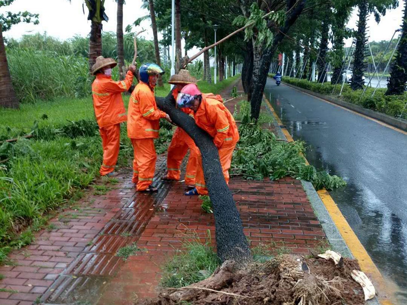 今天上午,三亞、陵水依舊大雨連綿,道路上有少量的積水,集團公司各區(qū)域負責人靠前指揮,組織人員冒雨對臺風過后的主次干道、綠化帶進行大清理,車輛、人員及時上路,對道路堆積泥沙進行沖洗,對散落垃圾、斷裂樹枝樹葉進行全面普掃清運,確保道路疏通整潔。園林綠化部迅速行動,對三亞鳳凰路、三亞灣路沿線的倒伏樹木進行扶正、清理折斷樹木。此外,公司還為每個水域保潔員配備救生衣,在確保安全的前提下做好河道、海域等水面垃圾清理工作,禁止工人風雨高峰期間涉水作業(yè)。