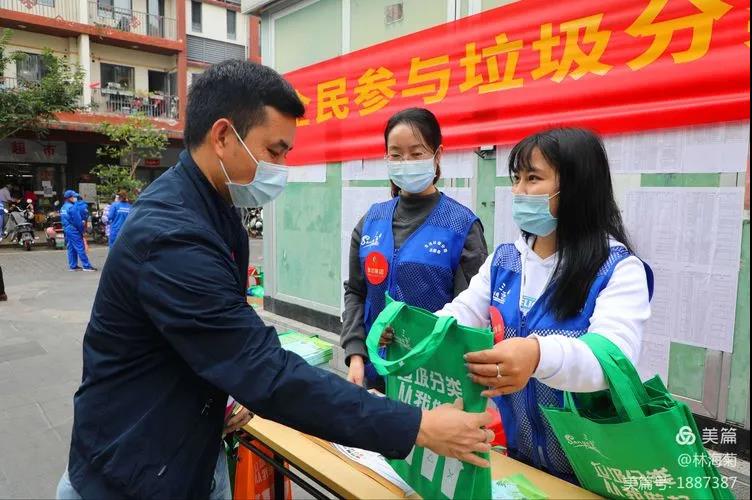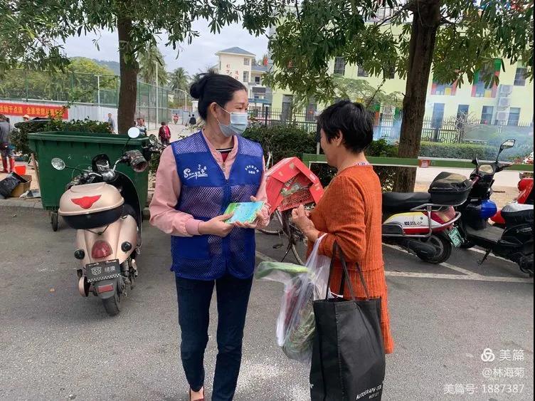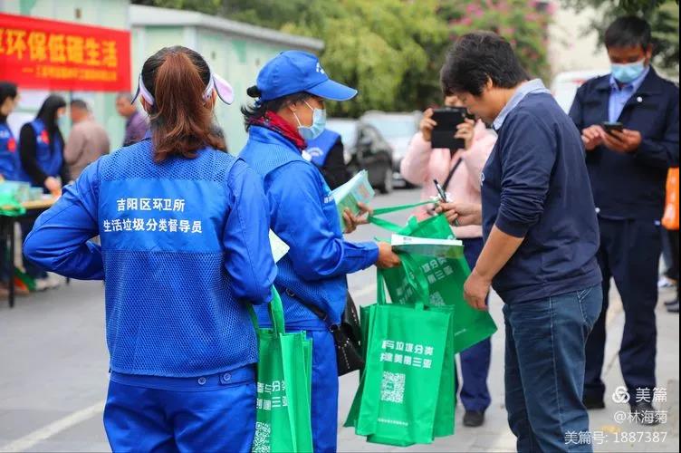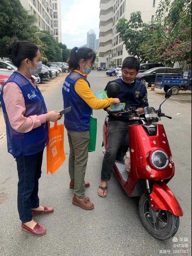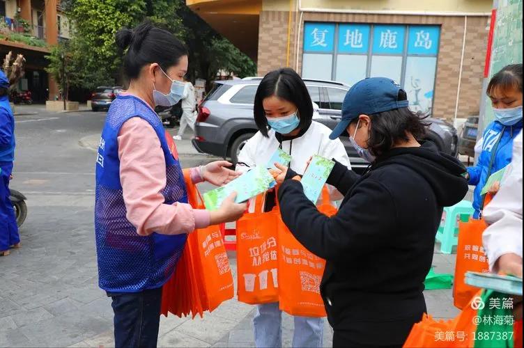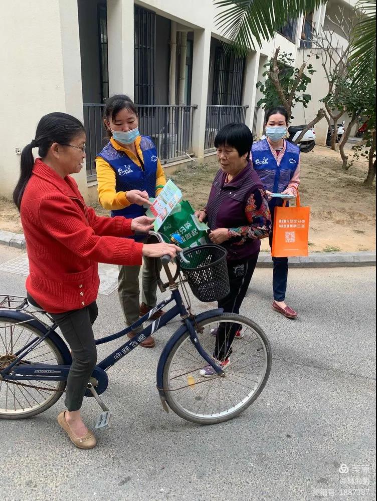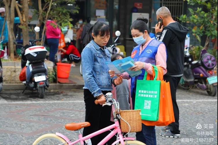 吉陽環(huán)衛(wèi)垃圾分類督導(dǎo)員與社區(qū)工作人員對居民分發(fā)垃圾分類手冊