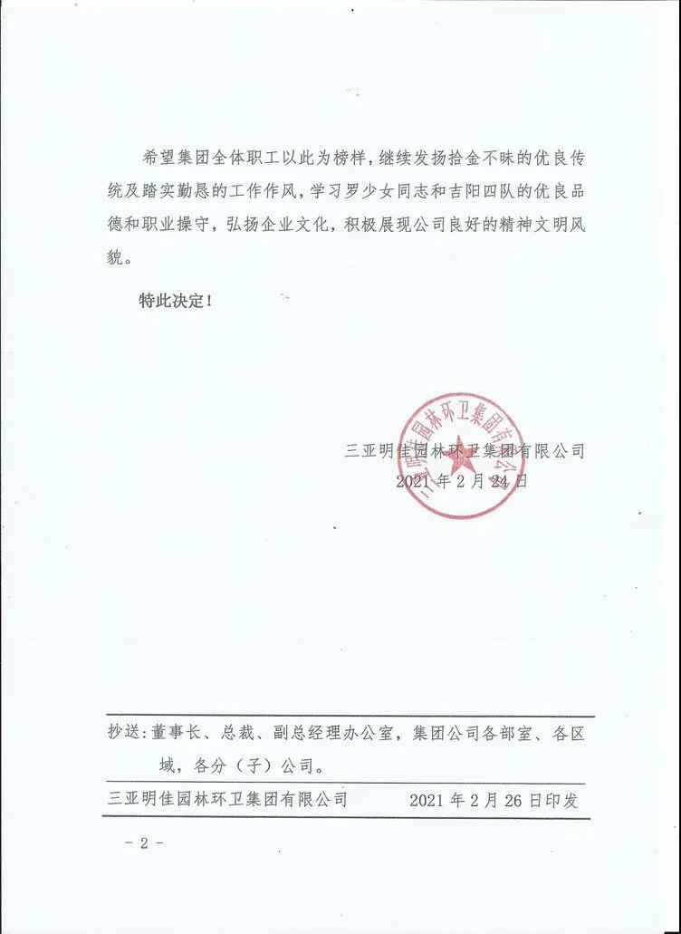 為表彰羅少女同志拾金不昧的精神,三亞明佳園林環(huán)衛(wèi)集團(tuán)有限公司于2021年2月25日 15:30時(shí),在集團(tuán)公司三樓會(huì)議室召開(kāi)拾金不昧表彰大會(huì)。明佳集團(tuán)黨支部書(shū)記、董事長(zhǎng)陳明,黨支部副書(shū)記、總裁陳云及20名員工代表參加會(huì)議。