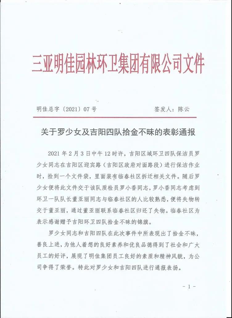 會(huì)上,明佳集團(tuán)黨支部書(shū)記、董事長(zhǎng)陳明宣讀了《關(guān)于羅少女及吉陽(yáng)四隊(duì)拾金不昧的表彰通報(bào)》