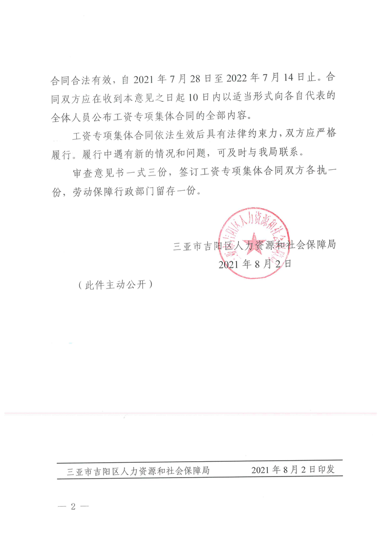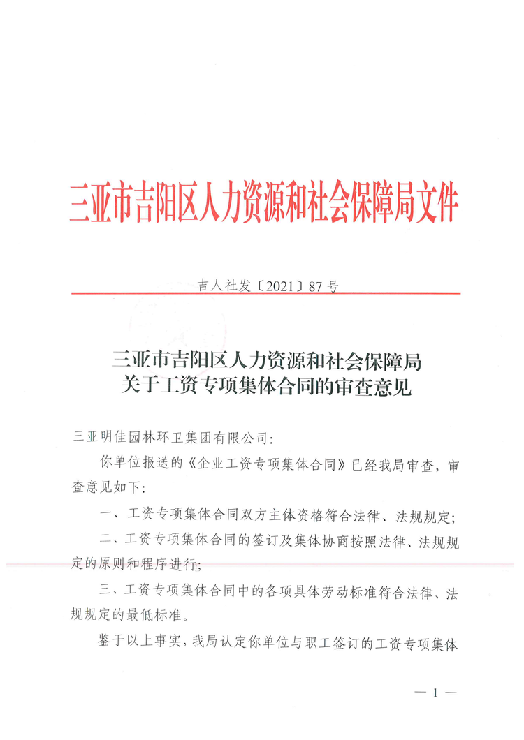 2021年8月2日,吉陽(yáng)區(qū)人社局審查通過(guò)我公司《企業(yè)工資專(zhuān)項(xiàng)集體合同》。8月4日?qǐng)?bào)三亞市總工會(huì)基層工作部備案。至此,三亞明佳園林環(huán)衛(wèi)集團(tuán)有限公司2021年度企業(yè)工資集體協(xié)商工作圓滿(mǎn)結(jié)束。