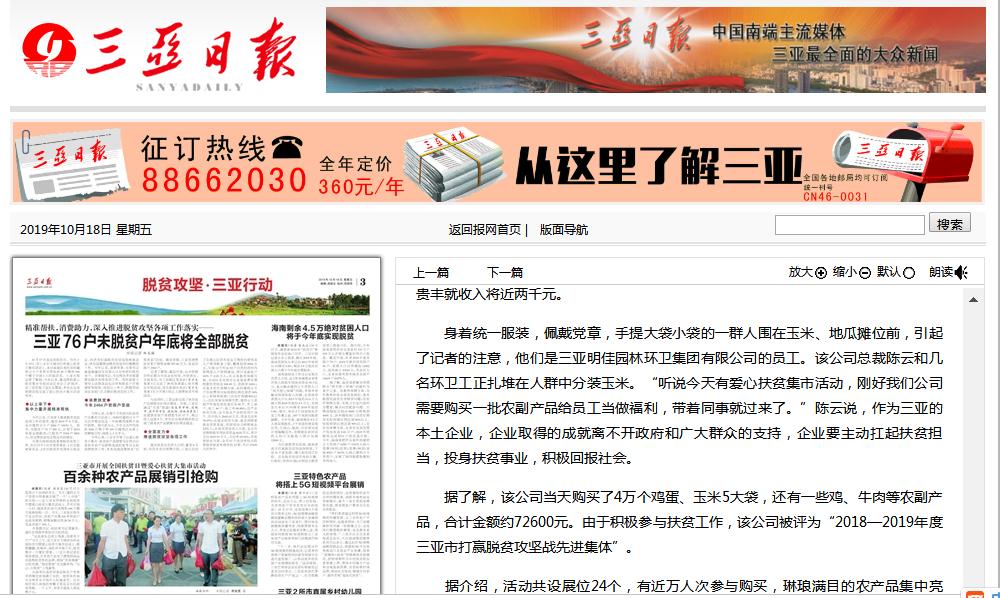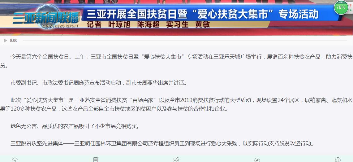 明佳集團(tuán)作為三亞的本土企業(yè),主動(dòng)扛起扶貧擔(dān)當(dāng),投身扶貧事業(yè),積極回報(bào)社會(huì)。在此次大采購(gòu)活動(dòng)中,集團(tuán)員工在總裁陳云的帶領(lǐng)下,購(gòu)買了4萬(wàn)個(gè)雞蛋、玉米5大袋,還有一些雞、牛肉等農(nóng)副產(chǎn)品,合計(jì)金額約72600元。三亞日?qǐng)?bào)和三亞新聞聯(lián)播分別對(duì)明佳集團(tuán)的愛心大采購(gòu)活動(dòng)進(jìn)行了報(bào)道。